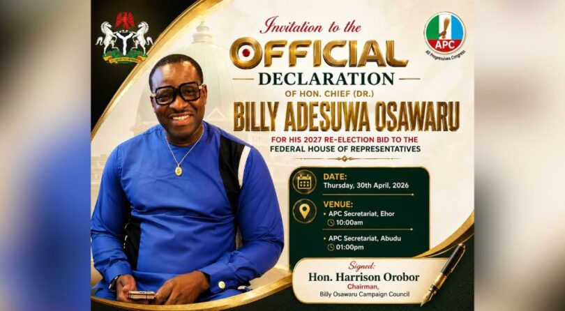 His declaration will take place on April 30, 2026, at the APC Secretariats in Ehor and Abudu, Edo State.