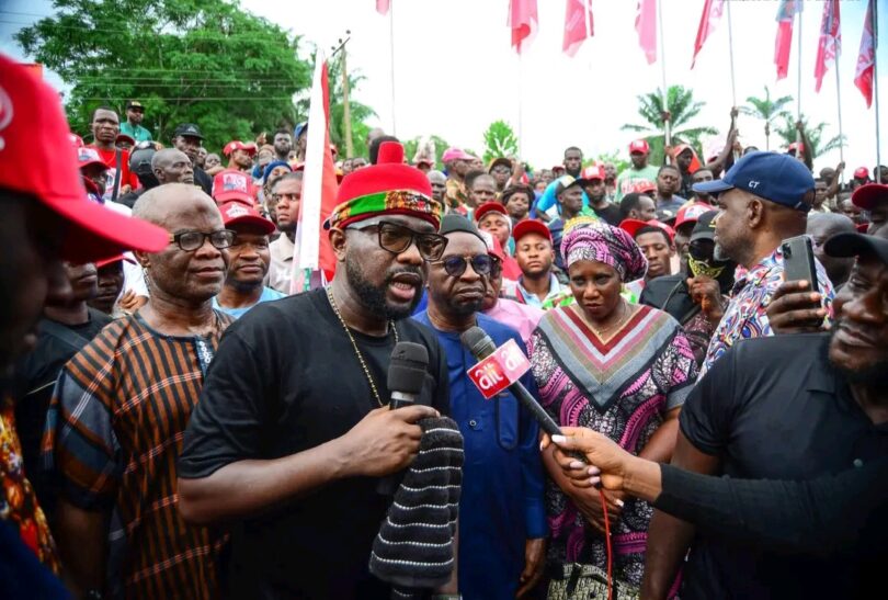 PREMIUM TIMES observed in the TV broadcast that Mr Ugochinyere was being escorted by a crowd of his supporters to the rally venue.