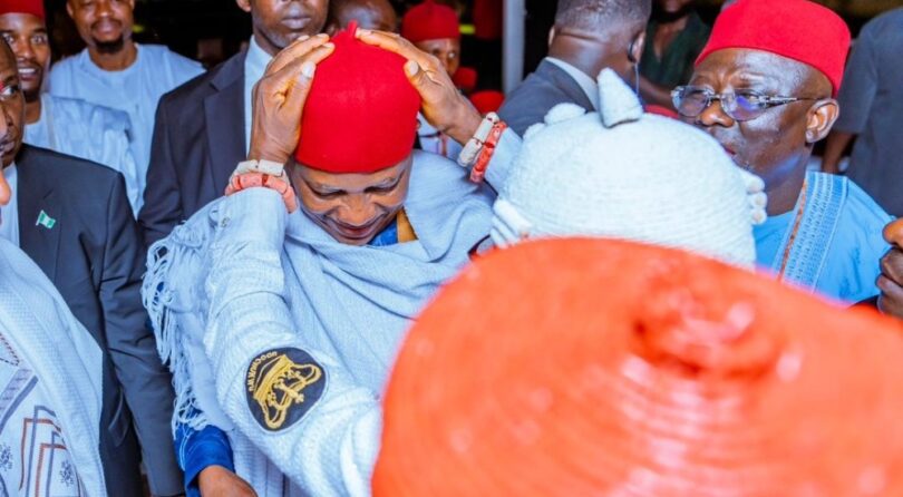 Vice President Kashim Shettima was conferred with the traditional title of Odoziani 1 of Aniocha, meaning “the one who restores the glory of the land,” during a condolence visit to the family home of Chairman of Heirs Holdings and UBA Group, Tony Elumelu, on Saturday.